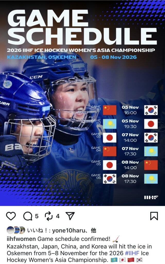 9月5日〜8日、カザフスタン・オスケメンで開催される「 2026 IIHF女子アジア選手権」に、#12 キム サランが韓国代表として参戦します‼️ 화이팅!!